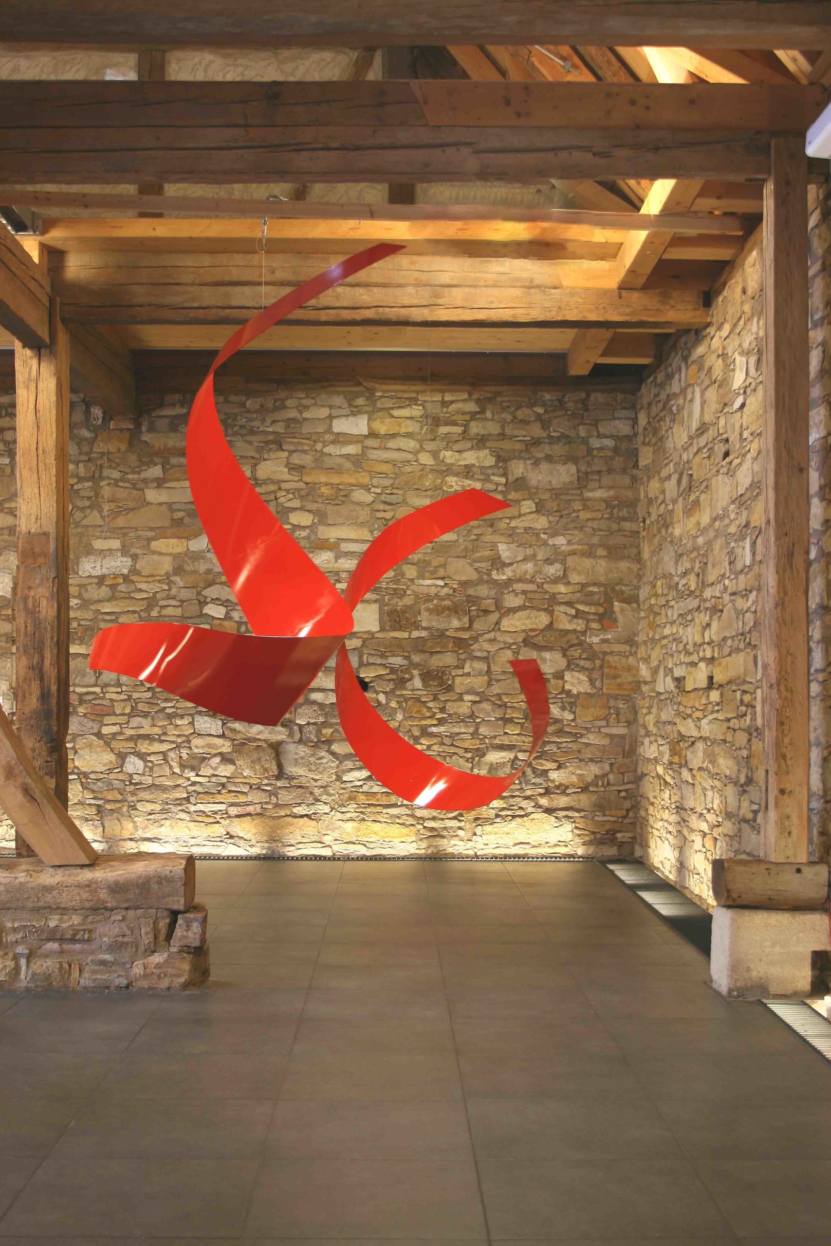 9. teilig, Gummi, Kunststoffstäbe, Durchmesser: 43-75 cm, 2011 — »Geteilte Inseln« nennt Susanne Immer eine Reihe runder Gummischeiben, durch die eine Vielzahl roter Kunststoffstäbe getrieben sind. Die 9 Inseln schweben quasi im Raum – von der Decke mit einem fast unsichtbaren Nylonfaden hängend – Durch leichtes Anstoßen geraten sie in eine suggestive Schwingung und Drehung um die eigene Achse.. Sie hat Inseln – man sollte hier den Titel gleich weiterdenken: auch Halbinseln – gesucht, die durch eine politische Grenze geteilt sind. Die deutsche Teilung, die zumindest im Sonderfall Berlin eine Inselsituation aufwies. Diese Grenzerfahrung an sich, die ein Land in zwei Teile zerriss und die deren Menschen auch entzweite, trieb uns früher um, auch noch Jahrzehnte danach. Die roten Kunststoffstäbe sind so arrangiert, dass sie zusammen die Außenform tatsächlich geteilter Inseln bilden. Berlin ist nicht mehr dabei, weil es sich aus der ohnehin singulären »Insel«-Lage befreien konnte. Dagegen finden sich unter anderem noch Nord- und Südkorea, Osttimor und Timor im Inselstaat Indonesien oder Zypern in teilweise brisanten Grenzkonflikten. . In Irland, wo man die Konflikte politisch für einigermaßen bereinigt ansehen durfte, reißt der Brexit die Insel wieder unfreiwillig entzwei, weil man eine Außengrenze der EU ziehen muss. Die Aktualität des Themas steht also außer Frage. Susanne Immer hat jede dieser Inseln als kleine Welt für sich gestaltet. Sie hat die Trennung auf abstrakte Weise sichtbar gemacht: zum einen steht das Durchstechen der gummierten Scheibe auch für das schmerzliche Bewusstsein einer unnatürlichen Zweiteilung. Trennung ist aber auch sichtbar in der Positiv-/Negativform von Vorder- und Rückseite. Was hier rein formal gelöst ist, hat gesellschaftliche Relevanz: Für Susanne Immer sollen die Inselbeispiele den Wunsch beflügeln, allen Formen von Begrenzung, Entgrenzung, Ausgrenzung usw. einen Widerstand entgegenzusetzen. Jede Gesellschaft hat ihre Inseln, die geteilt sind. Dr. G. Baumann* * Eröffnungsrede, Kunstforum, Weil der Stadt, 2018 -